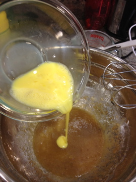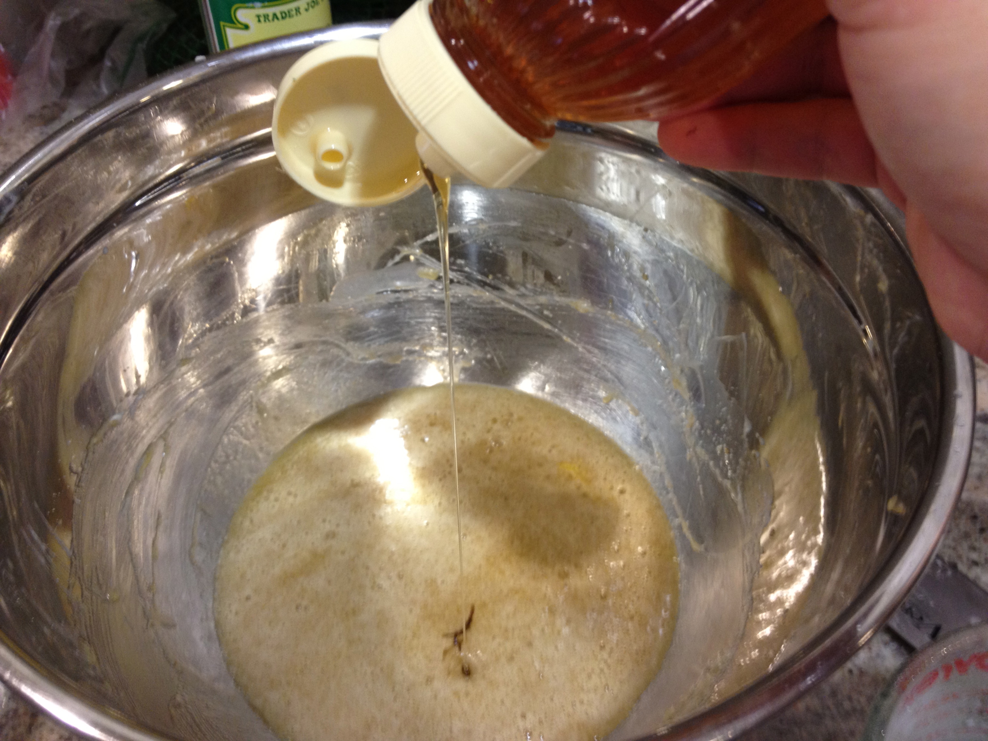 3. Cream butter and sugar in a large mixing bowl. Lighly beat 2 eggs in a small bowl and add 1/3 of the mixture to the creamed butter and sugar. Mix well then add another 1/3 of the egg mixture. Mix well again. Add the last 1/3 of the egg mixture and mix well once more. Stir in 2 teaspoon honey.