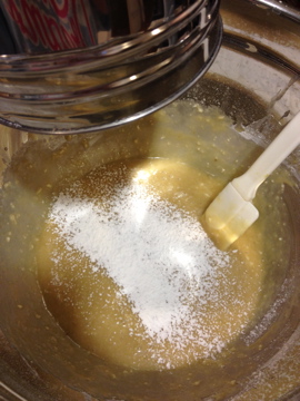 4. Mix the cake flour and baking powder, then add half the cake flour mixture and half of the milk to the large mixing bowl. Mix until all the ingredients comes together. Then add the remaining flour and milk and mix well once more.