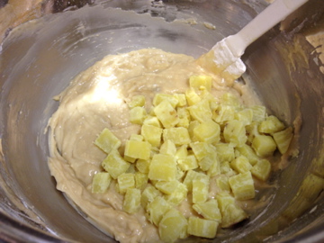 5. Once the wet and dry ingredients are mixed, mix in half of the Japanese sweet potatoes.