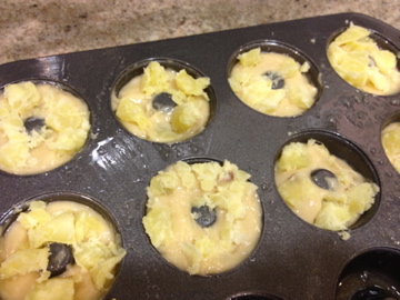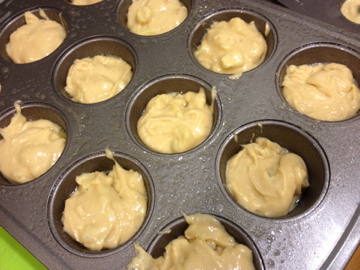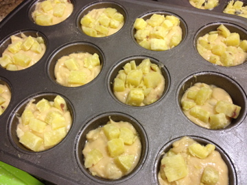 6. After mixing in half the sweet potatoes, fill the liners or muffin tips about 2/3 of the way with the batter. Add the remaining sweet potatoes to the tops of each muffin. I had some batter left over so I added it to my mini donut pan as to not waste any of it :).